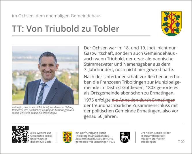 In diesem Buch "Trüboldingen - Erfmotingas - Salwenstein", das wir zum Abschluss der 1300-Jahr-Feierlichkeiten herausgegeben haben, finden Sie die Geschichte Triboltingens sowie den beschriebenen Dorfrundgang schön zusammengestellt - und die Geschichte von Ermatingen und Salenstein als "Zugabe" gleich auch noch!